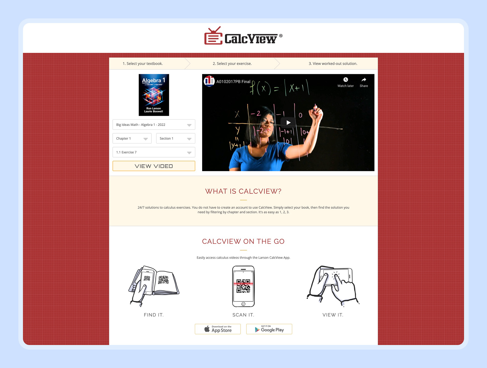 CalcView presents video solutions of selected exercises from textbooks by Ron Larson. This website includes 24/7 solutions to exercises. Users do not have to create an account to use CalcView. They simply select a book, then find the solution needed by filtering by chapter and section. It's as easy as 1, 2, 3. Scan QR codes found in Larson textbooks offering CalcView video exercises, or navigate to them by book, chapter, section. Users can watch instructors progress step-by-step through solutions, providing guidance to help them solve the selected exercises and others like it.