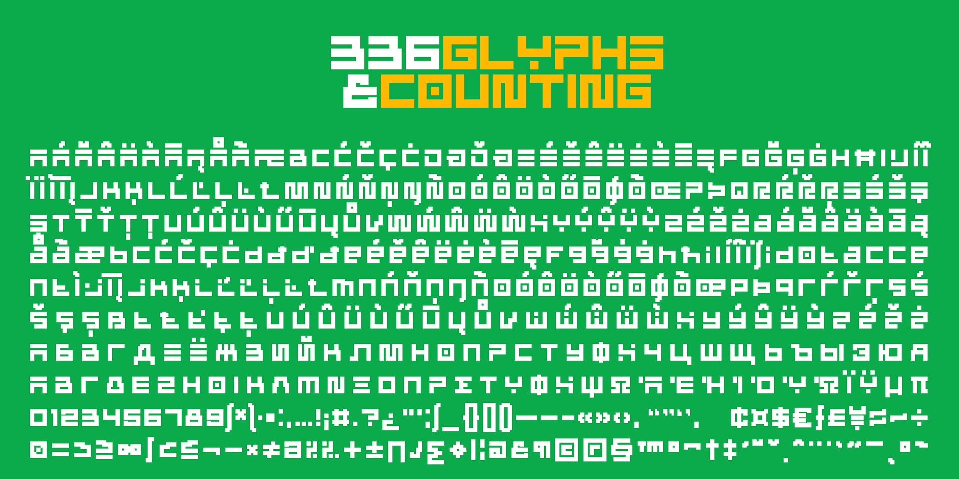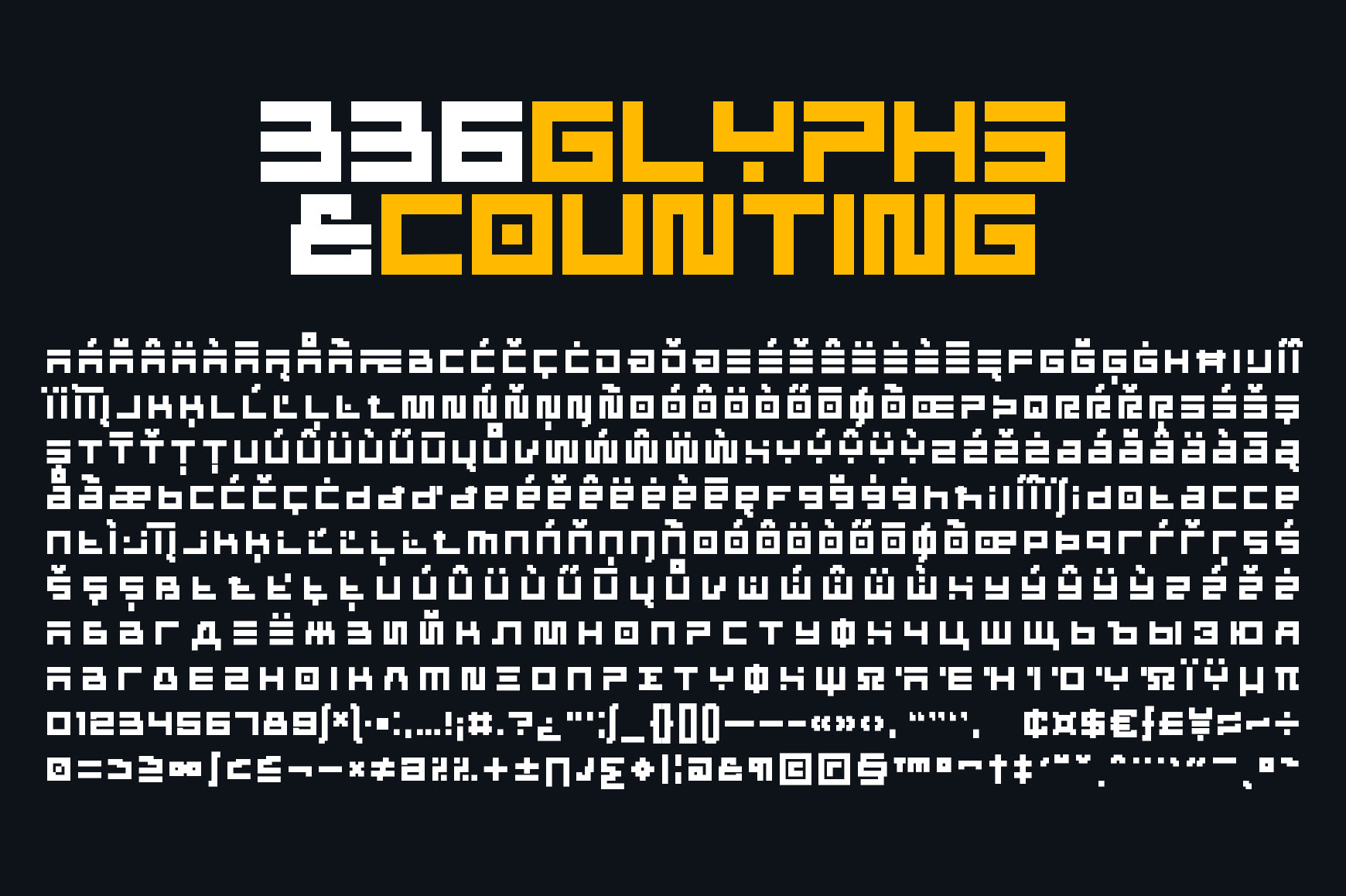 The font is intended to be used as a header or headline font. Most of the characters are based on the same rectangle and therefore contain the same width which displays symmetry. The font contains 300+ glyphs which includes uppercase letters, lowercase alternates, numbers, symbols, accented characters for multiple language support.