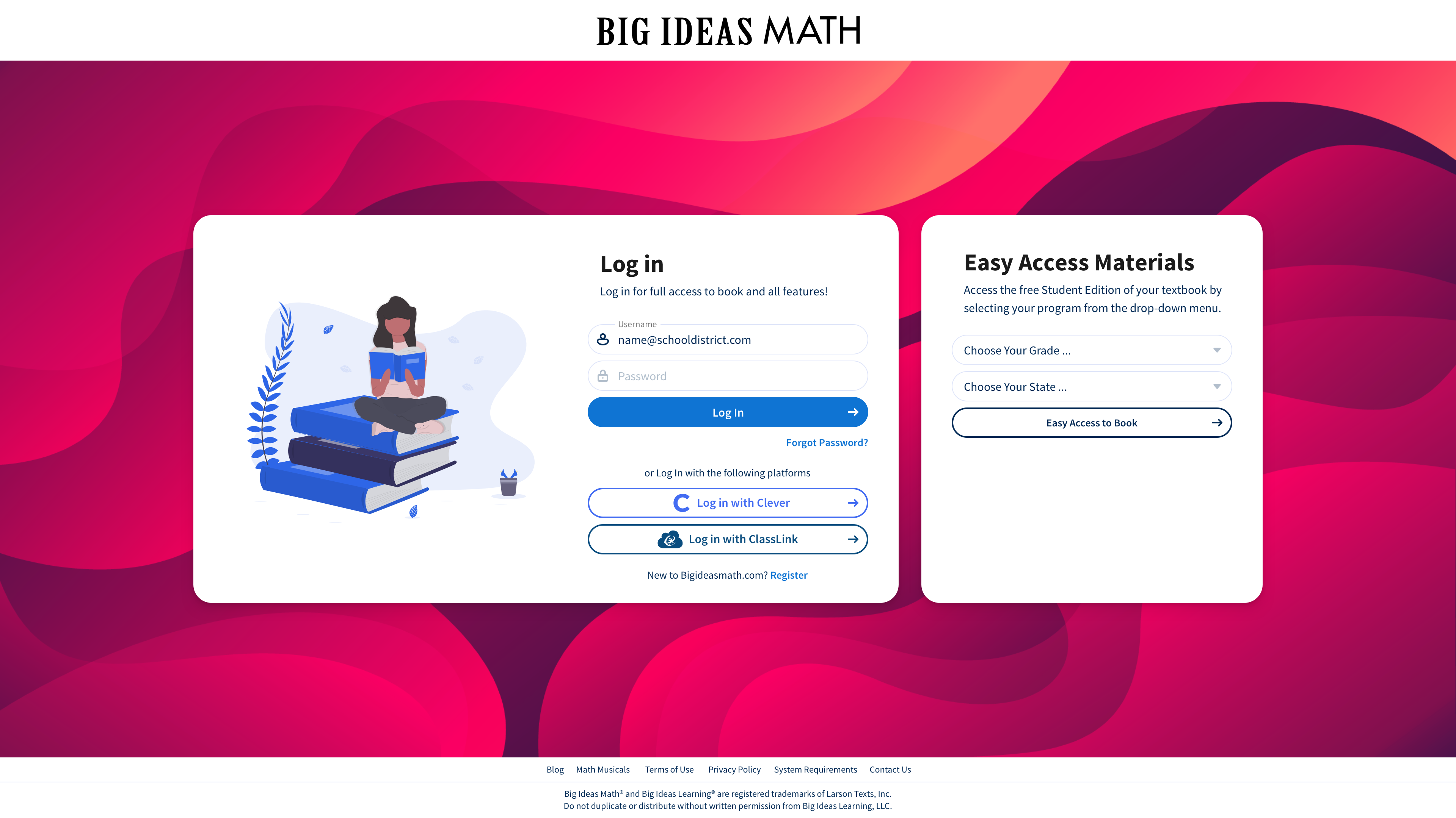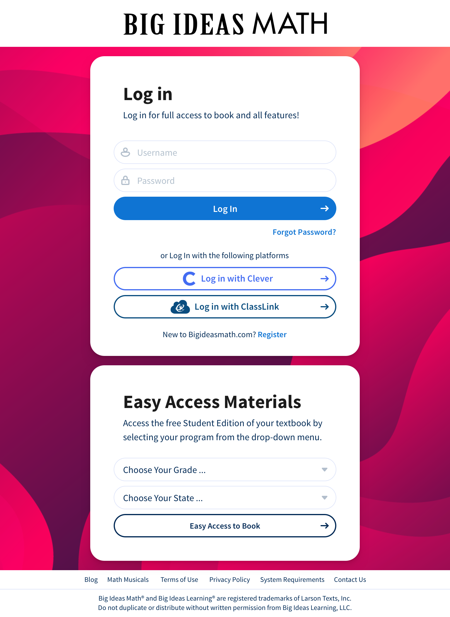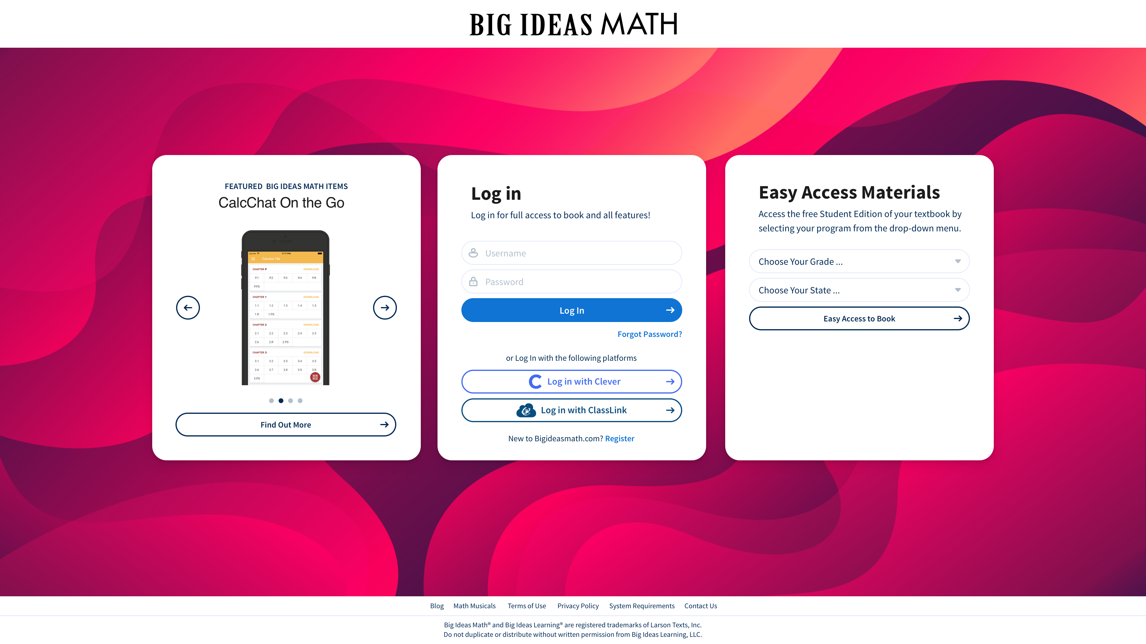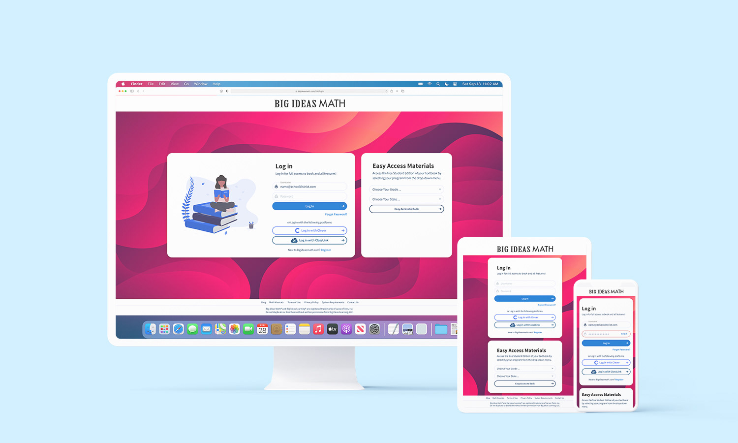 This is the initial screen to login to the Big Ideas Math® platform. The login page is the first thing that a user sees when accessing an online product. The aim of the redesign was to increase the user interface and experience for teachers and students. Special considerations were taken to meet accessibility standards and to ensure every user has a pleasant and smooth experience. Another aim of the redesign was to showcase the free educational material that are offered. Unlike the previous iteration, this login is responsive and works at any screen size, whether it is a 4k monitor or a mobile device. This project illustrates that a lot of thought and caring goes into the design considerations on something as small as a login screen.