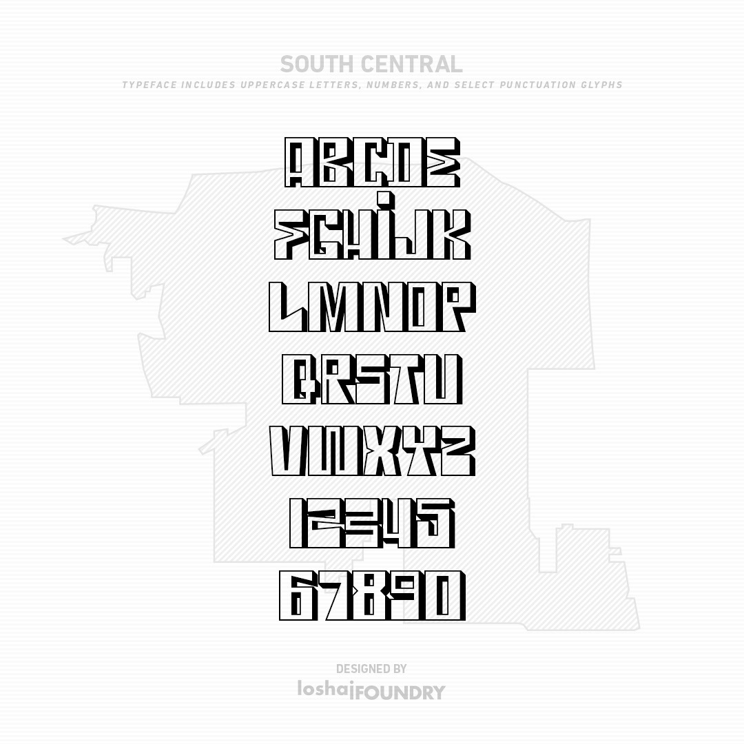 Graffiti has along history, specifically Los Angeles gang graffiti, which has has been around since the 1930s. South Central typeface includes uppercase letters, numbers, and select punctuation glyphs.